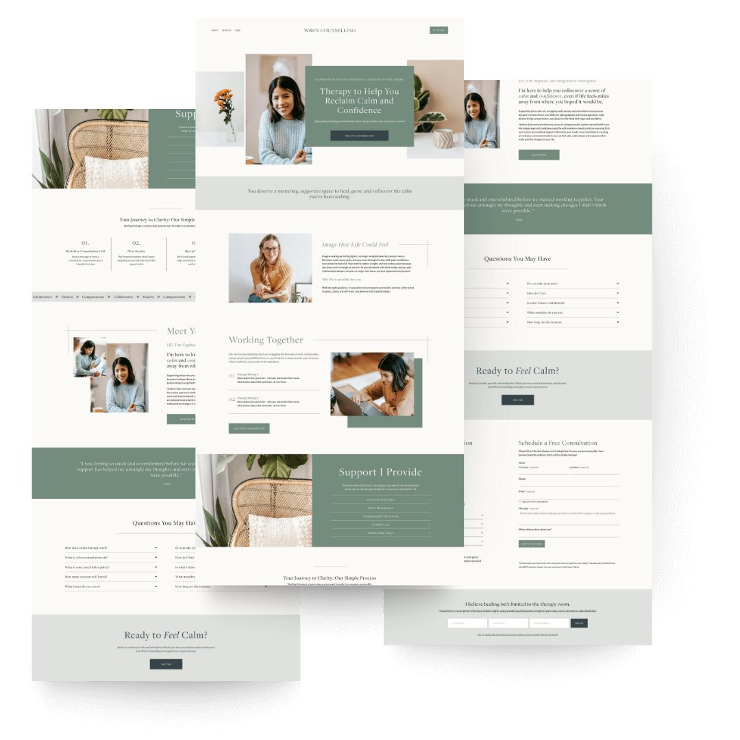 The templates are designed specifically for therapists, with layouts that build trust and guide visitors naturally toward becoming clients.