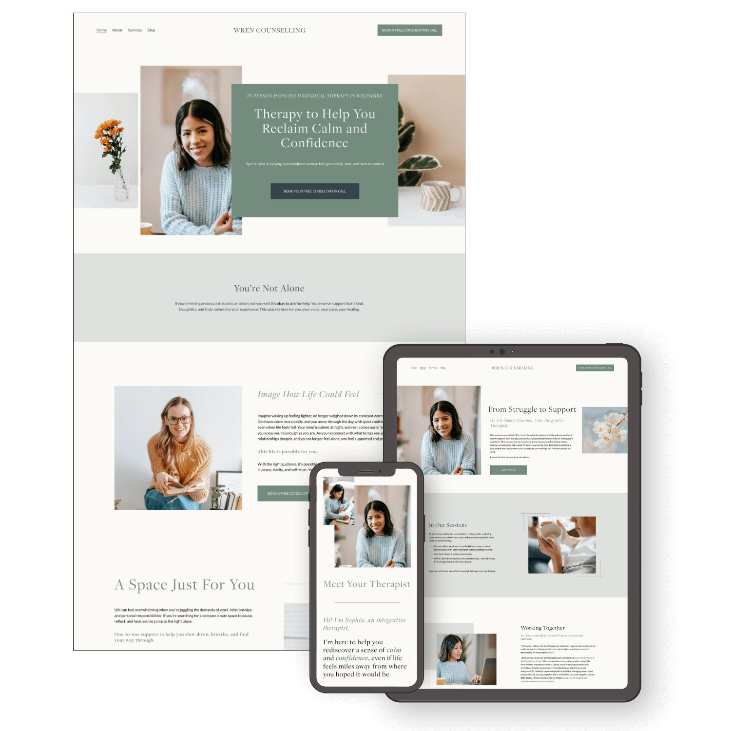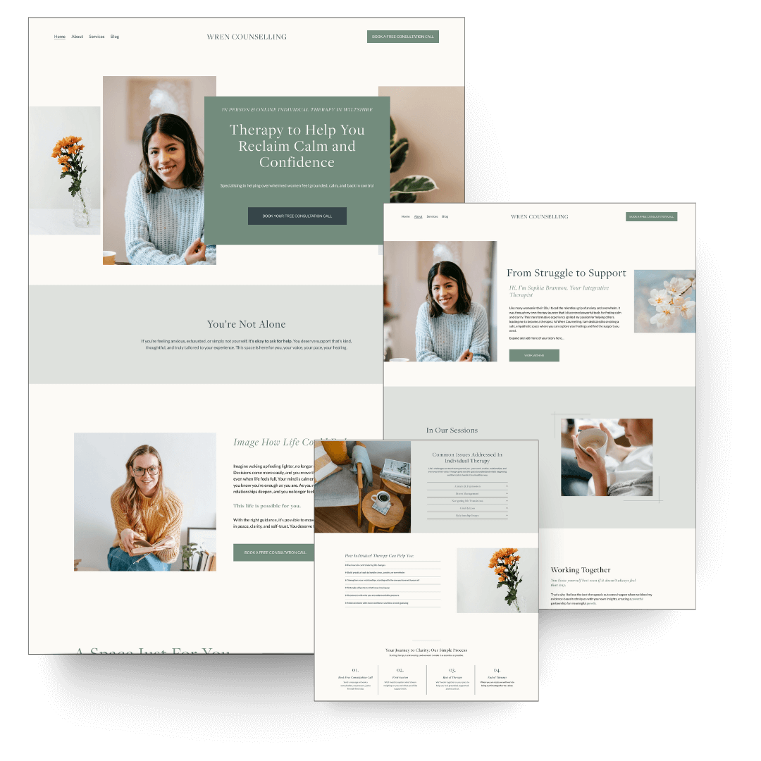 Wren is designed for therapists and counsellors who want a website that feels calm, considered, and quietly reassuring from the first scroll.